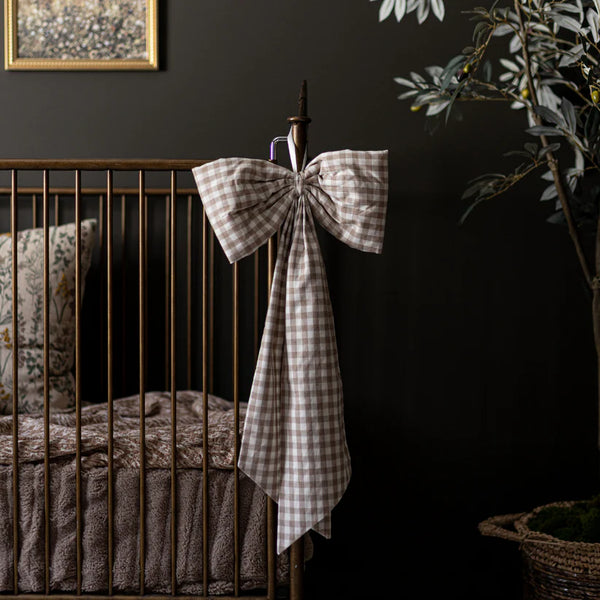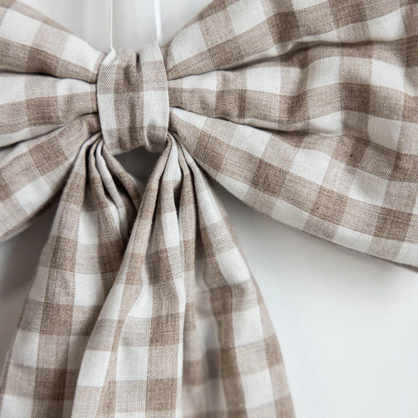 Beige Gingham Fabric Bows are made from luxurious cotton. Each bow is hand-crafted with a silk ribbon in the centre, making it easy for them to be hung. With its soft brown gingham detailing, this bow can easily be transitioned from holiday to spring decor. Use these bows in your nurseries, doorways, and mantles. These Brown Gingham Fabric Bows comes in 2 different sizes perfect for attaching to trees, wreaths, or incorporating into gift wrapping.