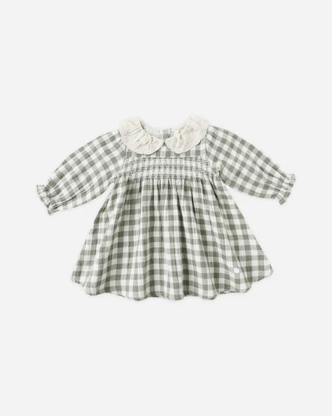 Our Callie Dress features a darling contrast eyelet collar, smocked front bodice, gathered skirt, and ruffle sleeves, with buttons at the back for easy dressing. Matching bloomers included with all sizes.
