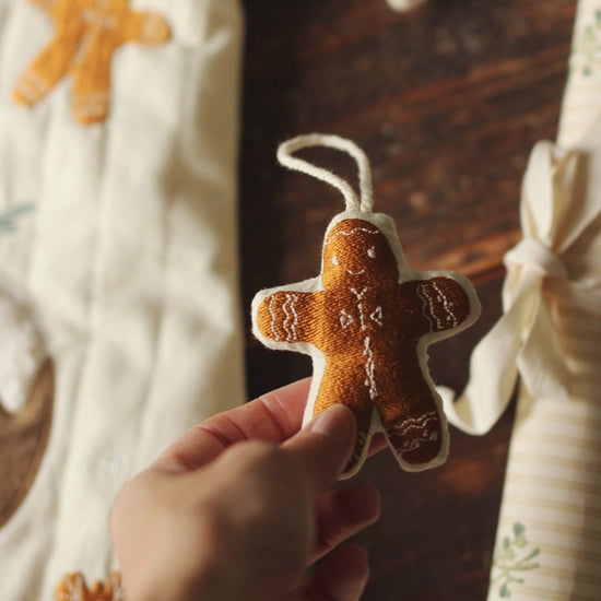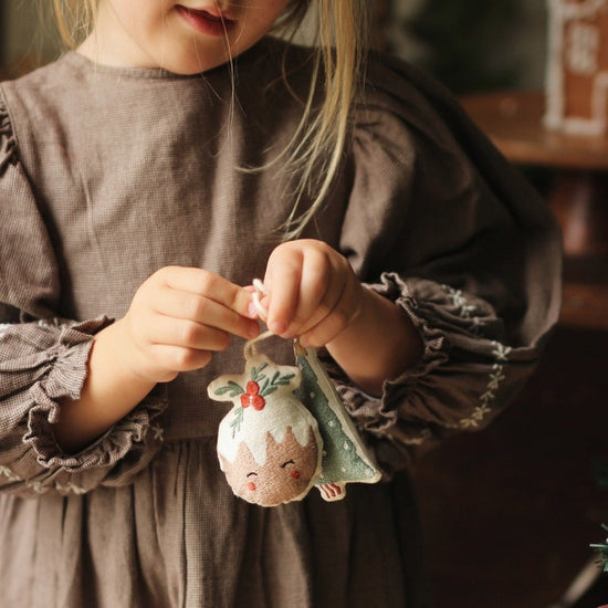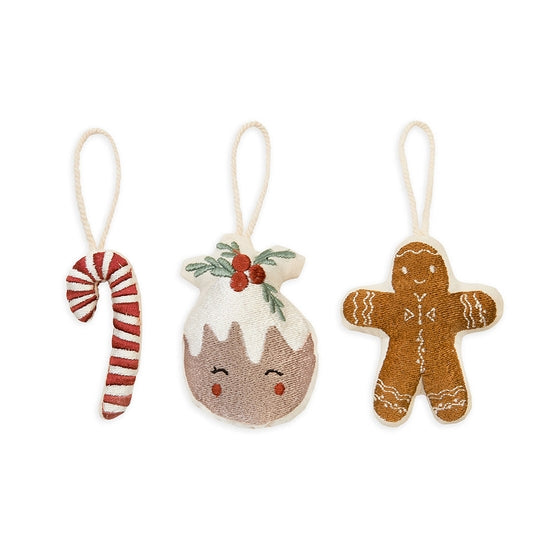 This set of 3 embroidered organic cotton tree decorations will add a touch of fun to any tree.