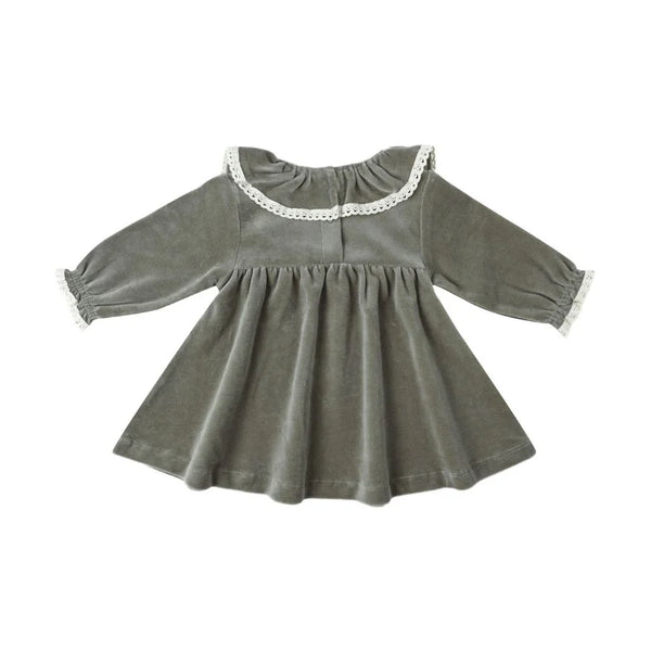 Our Velour Baby Dress features an empire waist dress with long sleeves and a cute ruffled collar.